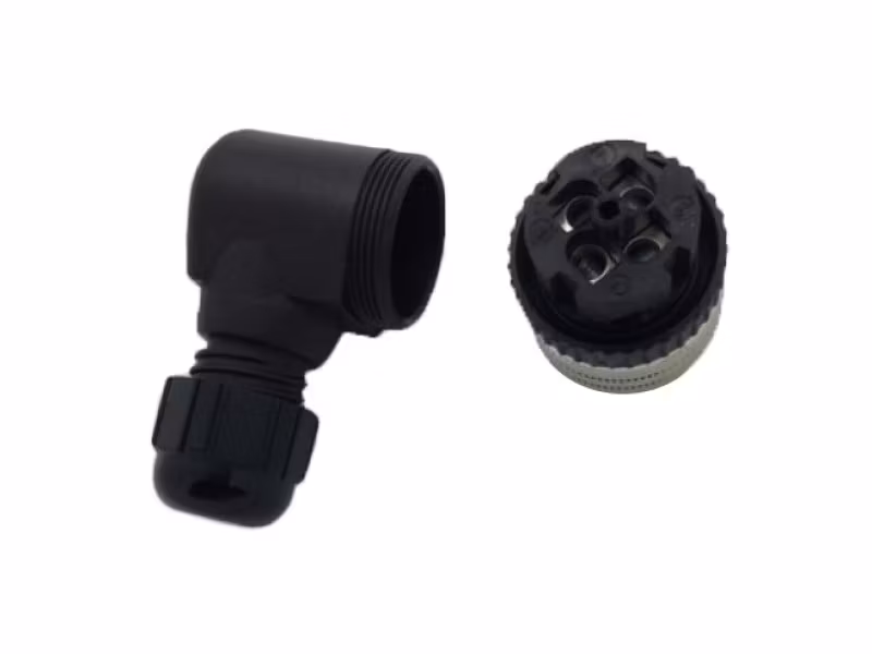 Vinklad kontakt till induktiv givare 03-185, med skruvanslutning för kabel.